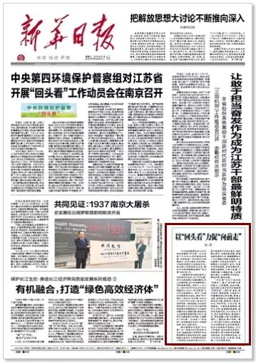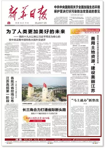 6月25日,又一篇署名“苏言”的文章刊登在《新华日报》头版。这篇《“马上就办”抓整改》以此次环保督察“回头看”为契机坚定地提出,落实督察整改,要以“马上就办”的作风“即知即改”、以“绝不过夜”的态度“细知细改”、以“一抓到底”的韧劲“深知深改”、以“求真务实”的精神“真知真改”。