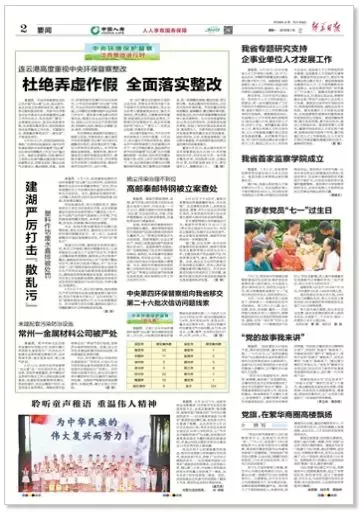 (图为2018年7月2日《新华日报》2版截图,多条新闻聚焦环保督察“回头看”。)
