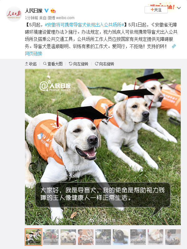 5月1日起,《安徽省无障碍环境建设管理办法》施行。办法规定,视力残疾人可依规携带导盲犬出入公共场所及搭乘公共交通工具,公共场所工作人员应按国家有关规定提供无障碍服务。导盲犬是温顺聪明、训练有素的工作犬。爱同行,不拒绝!支持的转!