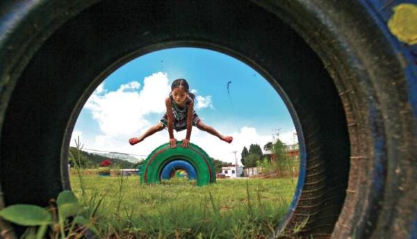 孩子们用废轮胎进行体育锻炼。图片来源:海峡都市报