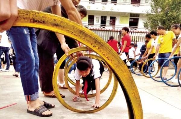 从那之后,她就开始走上了自制各种体育游戏器材的路:废弃的自行车轮胎可以做呼啦圈、滚轮,小轿车轮胎经过改装后可以变成“轮胎车”,也可以做障碍柱、跳马。