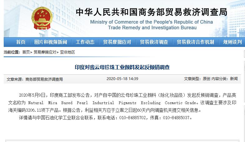 据商务部贸易救济调查局网站5月18日消息,2020年5月9日,印度商工部发布公告,对产自中国的云母珍珠工业颜料(除化妆品级)发起反倾销调查,产品英文名称为 Natural Mica Based Pearl Industrial Pigments Excluding Cosmetic Grade。该调查主要涉及印海关编码3206.11项下产品。根据公告,利益相关方应于立案之日起60天内向调查机关提交相关信息。