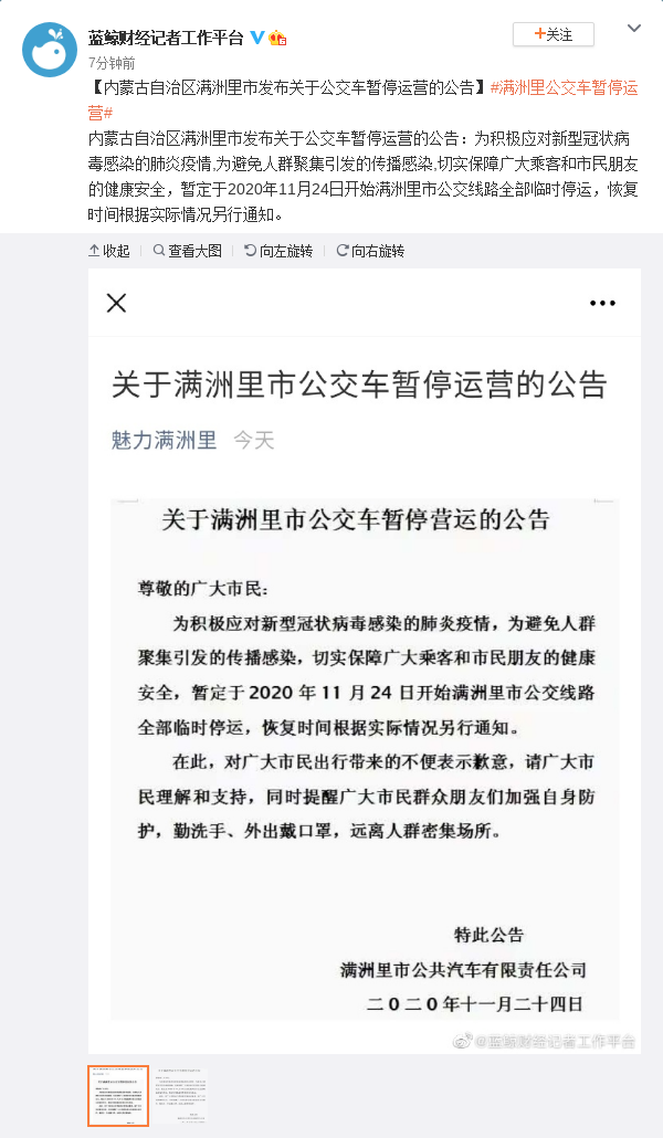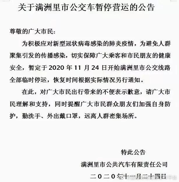内蒙古自治区满洲里市发布关于公交车暂停运营的公告:为积极应对新型冠状病毒感染的肺炎疫情,为避免人群聚集引发的传播感染,切实保障广大乘客和市民朋友的健康安全,暂定于2020年11月24日开始满洲里市公交线路全部临时停运,恢复时间根据实际情况另行通知。