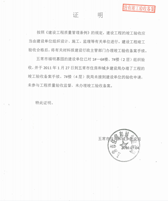 不但《建设项目选址平面图》没有标注“七号楼1-4”,就连五常市住房和城乡规划局2019年7月4日出具的《证明》(见下图图二)中也明确表示,“五常市福明嘉园的建设单位已对1-6#楼、7#楼(2层)组织验收,并于2011年1月27日到五常市住房和城乡建设局办理了工程验收备案手续,7#楼(4层)我局未接到建设单位的验收申请,未参与工程质量验收监督,未办理竣工验收备案。”