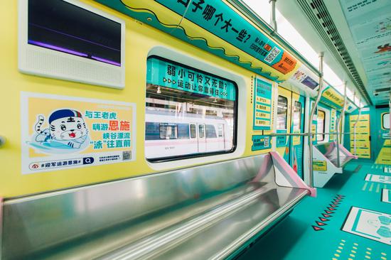 在此次武汉地铁嘉年华军运主题活动中,恩施王老虎化身为运动健将,玩跳伞、举火炬,摆出各种超萌运动造型为军运会打Call。同时,王老虎也不忘带上家乡恩施州的特色,结合军运口号为恩施州各个景点喊话,盛情邀请世界各地游客前来恩施州做客。据悉,此次军运主题地铁2号线,将运营一个多月时间,覆盖国庆长假和军运会期间,期间搭乘武汉地铁2号线的乘客皆可以遇见恩施王老虎。@恩施州文化和旅游局 官方微博在线上同时发布萌系九宫格精品内容,送出恩施州各景区门票好礼,吸引更多网友关注并参与互动。